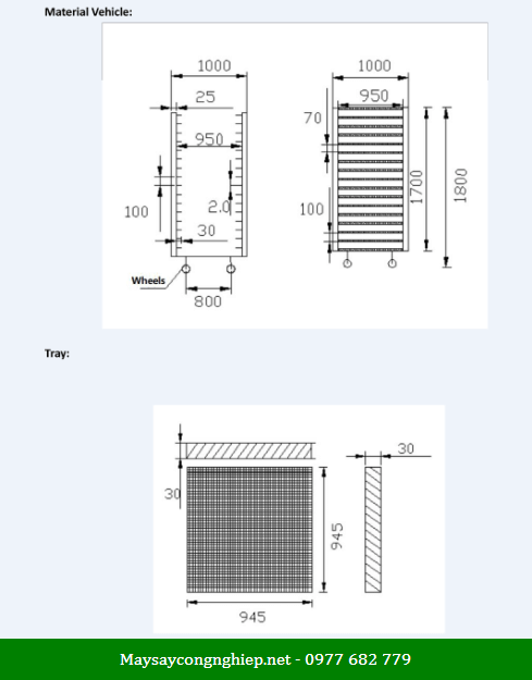 | Kích thước khay sấy (mm) | 1200x800x20 |